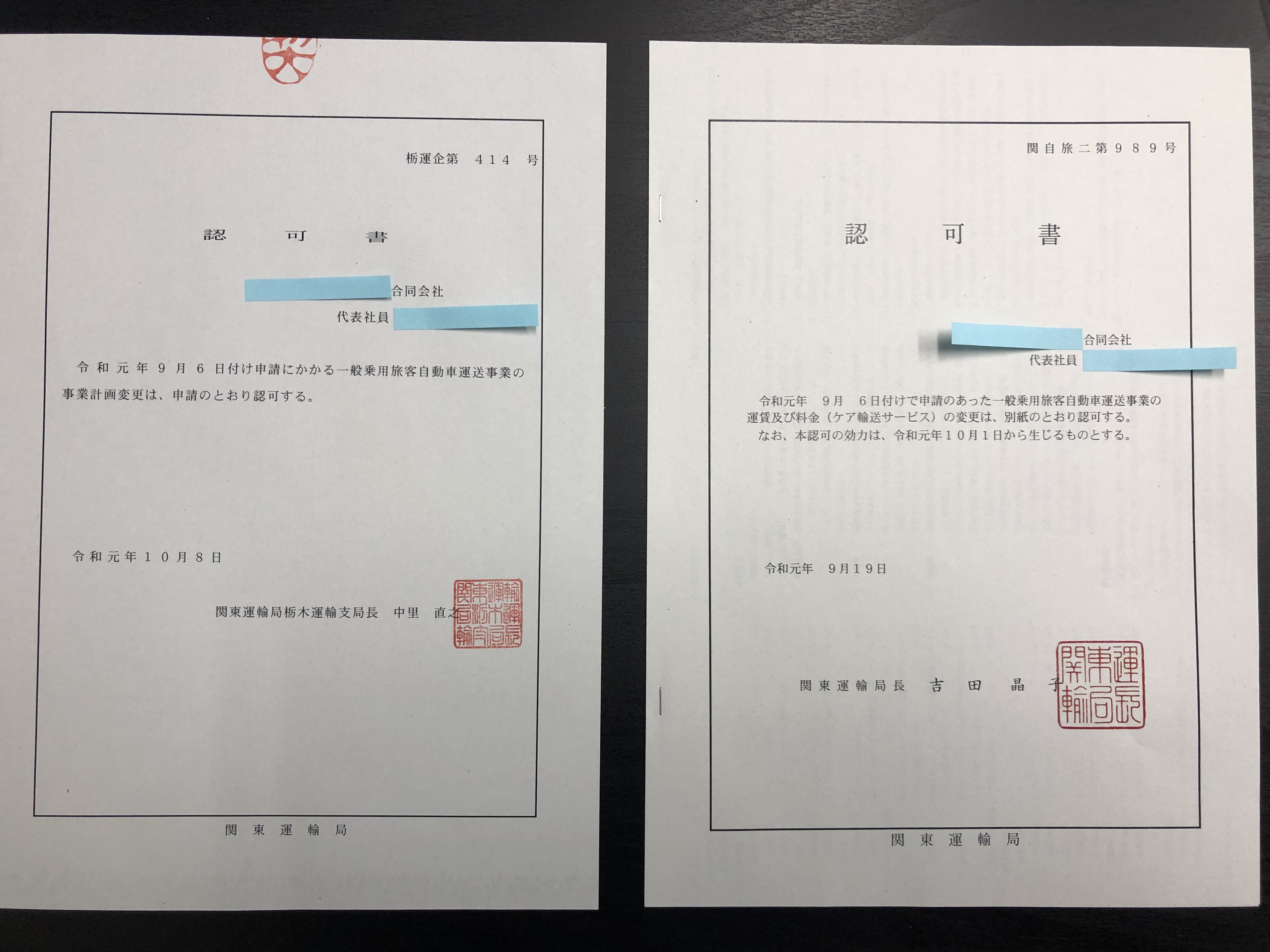 ということで無事に両方認可が下りたのですが、運賃は運輸局の権限に対し、事業計画変更は運輸支局の権限で決済されるので、写真を見ていただければ分かるかと思いますが局長名と支局長名でそれぞれ認可が下りていて、日付もそれぞれ別な日付になっています。